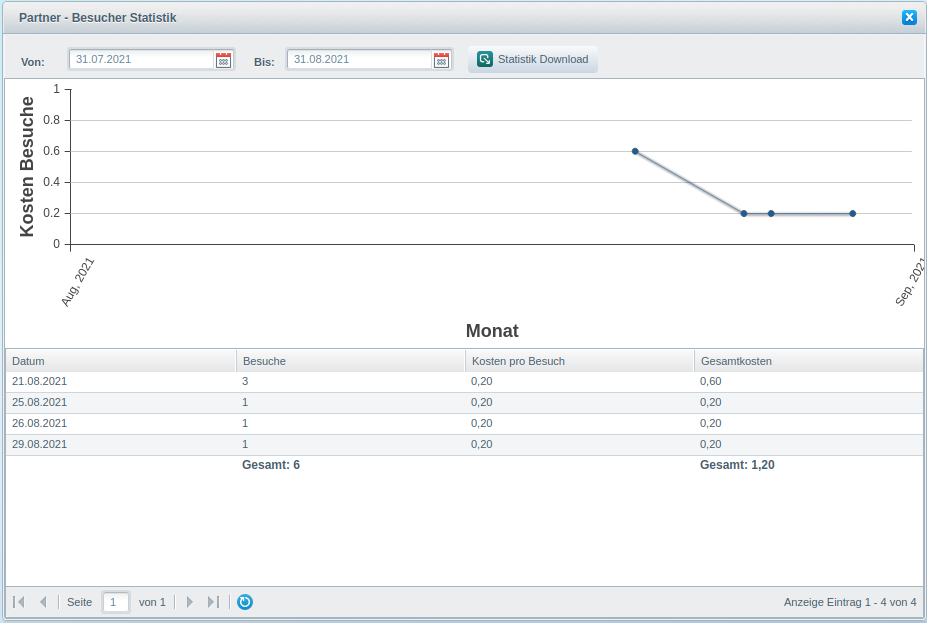 - Detaillierte Statistik zu den Besuchern und der Gesamtkosten